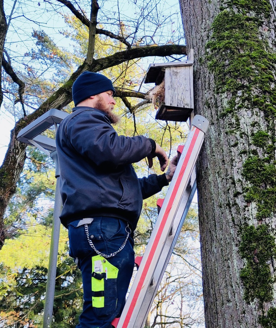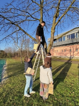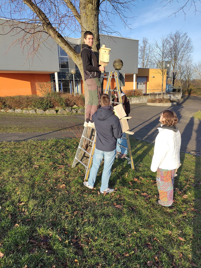 schuleigenen Holzwerkstatt gefertigte Nistkästen für heimische Vögel aufgehängt.